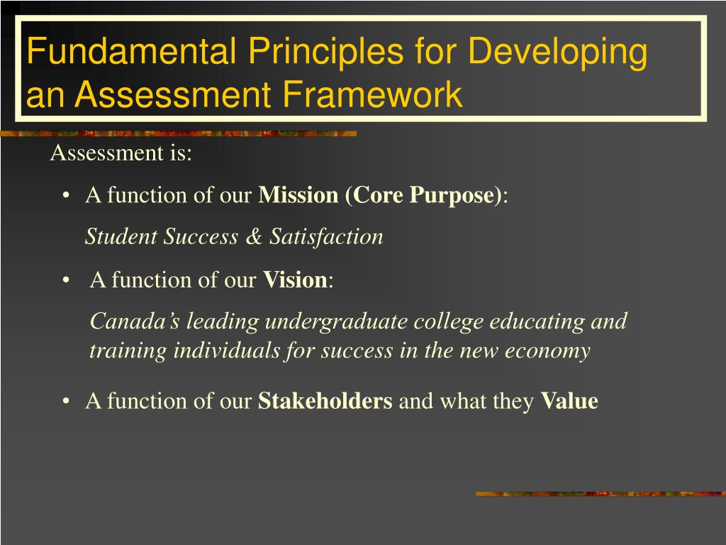 Fundamental Principles for Developing an Assessment Framework Assessment is: • A function of our Mission (Core Purpose): • Student Success & Satisfaction • A function of our Vision: • Canada’s leading undergraduate college educating and training individuals for success in the new economy • A function of our Stakeholders and what they Value