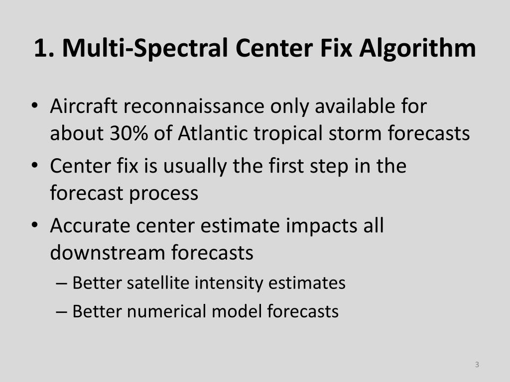 1. Multi-Spectral Center Fix Algorithm • Aircraft reconnaissance only available for about 30% of Atlantic tropical storm forecasts • Center fix is usually the first step in the forecast process • Accurate center estimate impacts all downstream forecasts • Better satellite intensity estimates • Better numerical model forecasts