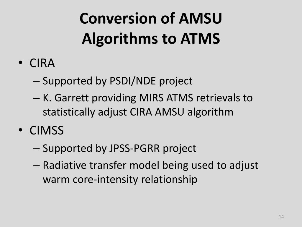 Conversion of AMSU Algorithms to ATMS • CIRA • Supported by PSDI/NDE project • K. Garrett providing MIRS ATMS retrievals to statistically adjust CIRA AMSU algorithm • CIMSS • Supported by JPSS-PGRR project • Radiative transfer model being used to adjust warm core-intensity relationship