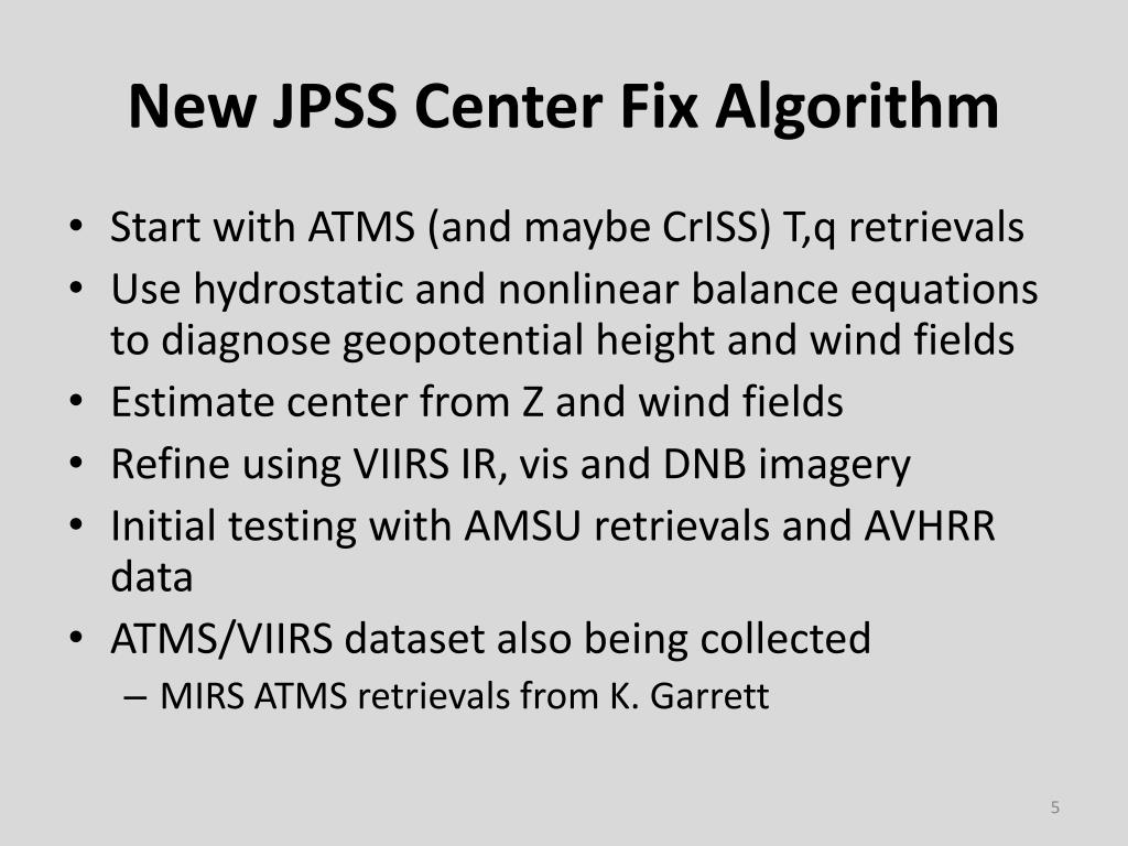 New JPSS Center Fix Algorithm • Start with ATMS (and maybe CrISS) T,q retrievals • Use hydrostatic and nonlinear balance equations to diagnose geopotential height and wind fields • Estimate center from Z and wind fields • Refine using VIIRS IR, vis and DNB imagery • Initial testing with AMSU retrievals and AVHRR data • ATMS/VIIRS dataset also being collected • MIRS ATMS retrievals from K. Garrett