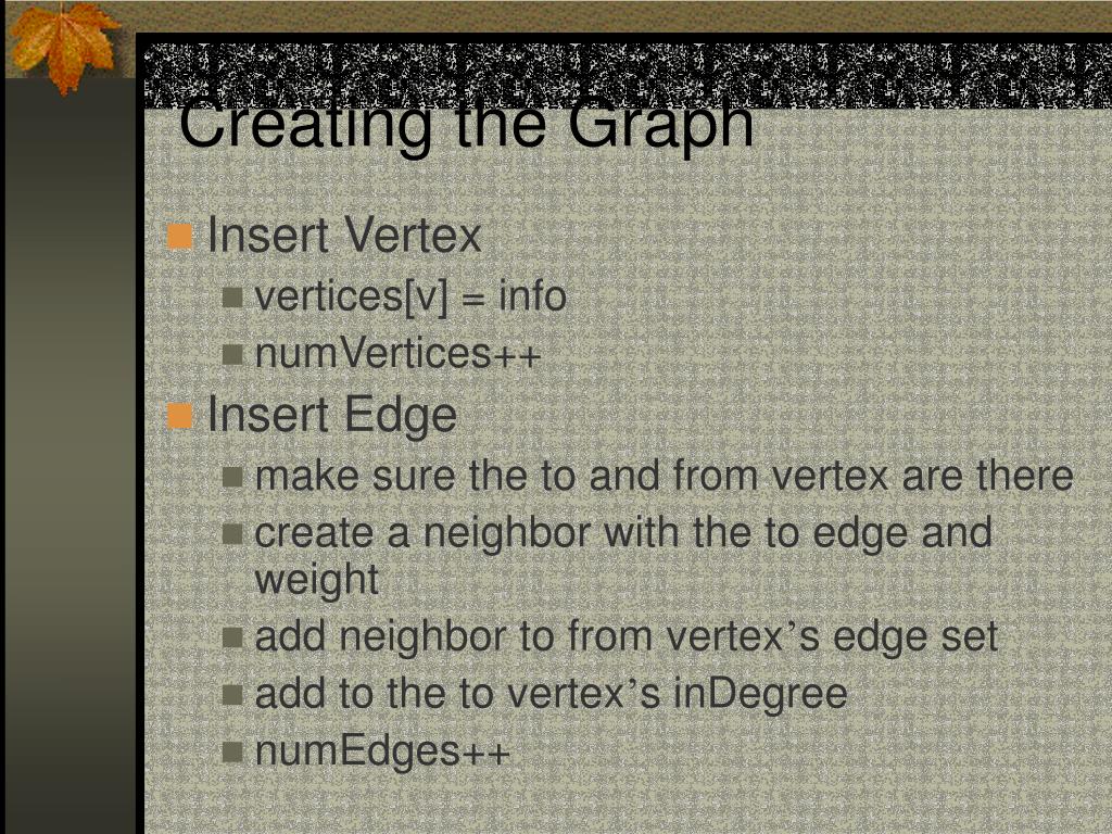 Creating the Graph • Insert Vertex • vertices[v] = info • numVertices++ • Insert Edge • make sure the to and from vertex are there • create a neighbor with the to edge and weight • add neighbor to from vertex’s edge set • add to the to vertex’s inDegree • numEdges++