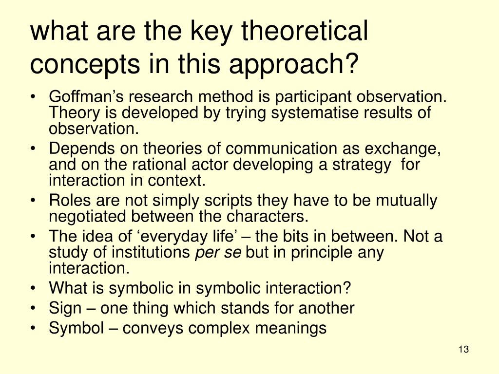 what are the key theoretical concepts in this approach? • Goffman’s research method is participant observation. Theory is developed by trying systematise results of observation. • Depends on theories of communication as exchange, and on the rational actor developing a strategy for interaction in context. • Roles are not simply scripts they have to be mutually negotiated between the characters. • The idea of ‘everyday life’ – the bits in between. Not a study of institutions per se but in principle any interaction. • What is symbolic in symbolic interaction? • Sign – one thing which stands for another • Symbol – conveys complex meanings