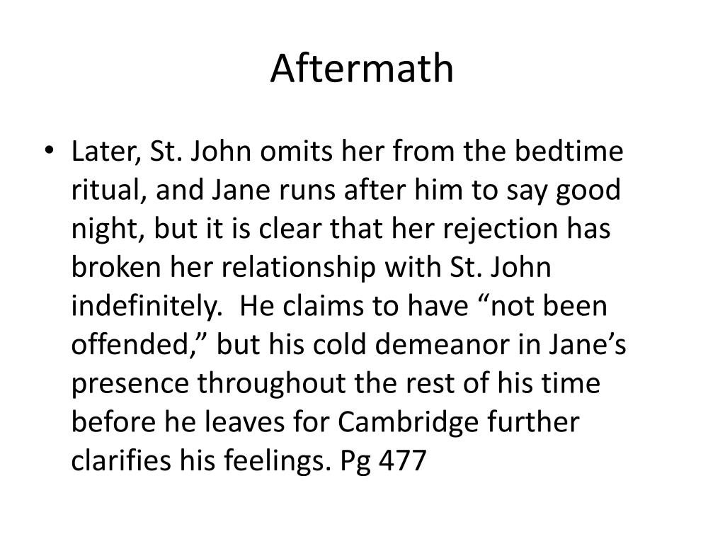 Aftermath • Later, St. John omits her from the bedtime ritual, and Jane runs after him to say good night, but it is clear that her rejection has broken her relationship with St. John indefinitely. He claims to have “not been offended,” but his cold demeanor in Jane’s presence throughout the rest of his time before he leaves for Cambridge further clarifies his feelings. Pg 477
