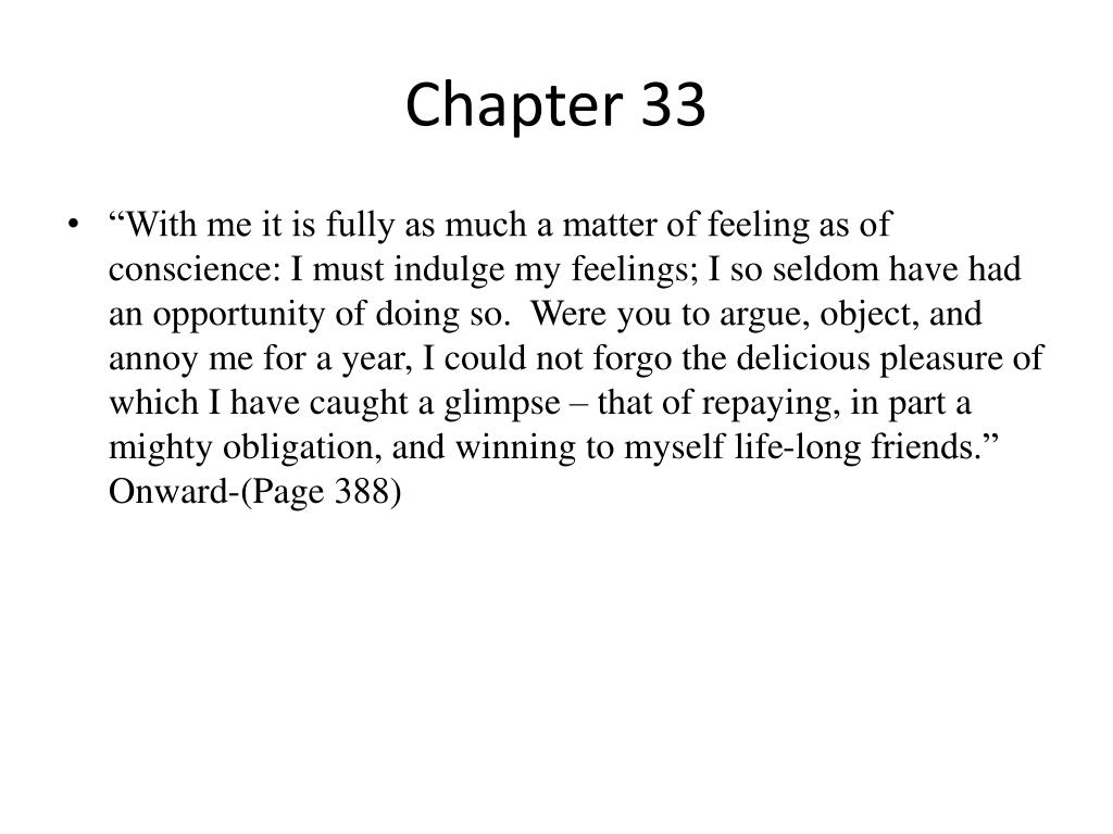 Chapter 33 • “With me it is fully as much a matter of feeling as of conscience: I must indulge my feelings; I so seldom have had an opportunity of doing so. Were you to argue, object, and annoy me for a year, I could not forgo the delicious pleasure of which I have caught a glimpse – that of repaying, in part a mighty obligation, and winning to myself life-long friends.” Onward-(Page 388)
