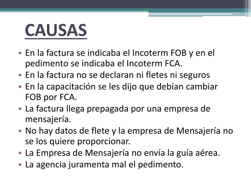 CAUSAS • En la factura se indicaba el Incoterm FOB y en el pedimento se indicaba el Incoterm FCA. • En la factura no se declaran ni fletes ni seguros • En la capacitación se les dijo que debían cambiar FOB por FCA. • La factura llega prepagada por una empresa de mensajería. • No hay datos de flete y la empresa de Mensajería no se los quiere proporcionar. • La Empresa de Mensajería no envía la guía aérea. • La agencia juramenta mal el pedimento.