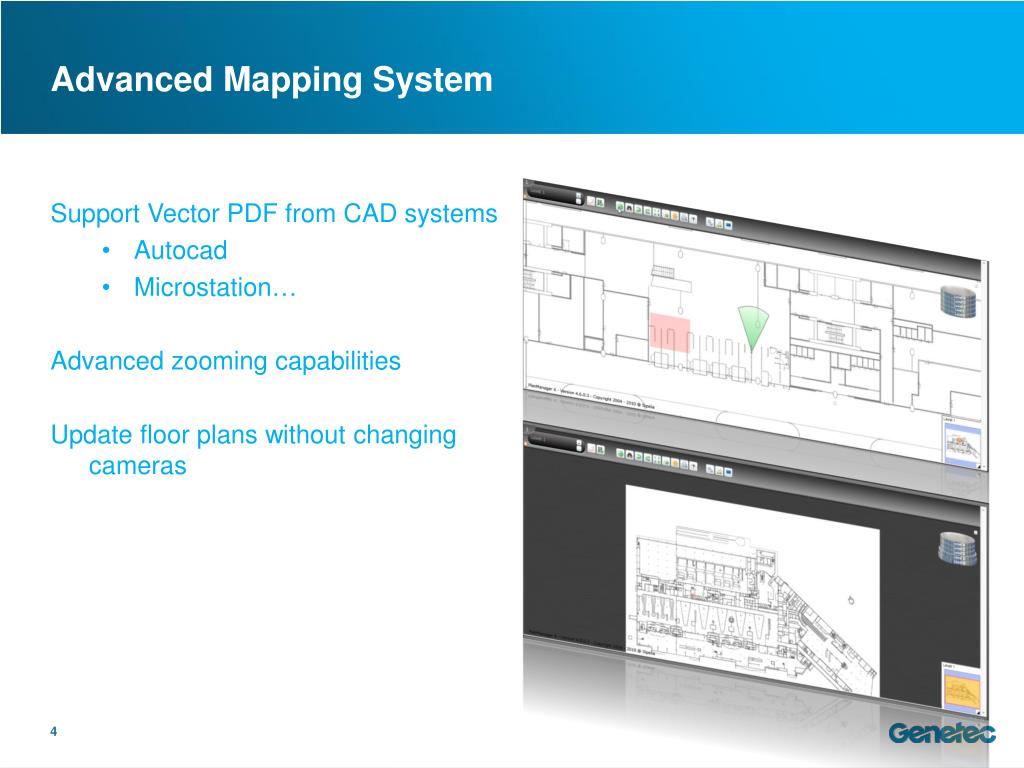 Advanced Mapping System Support Vector PDF from CAD systems • Autocad • Microstation… Advanced zooming capabilities Update floor plans without changing cameras