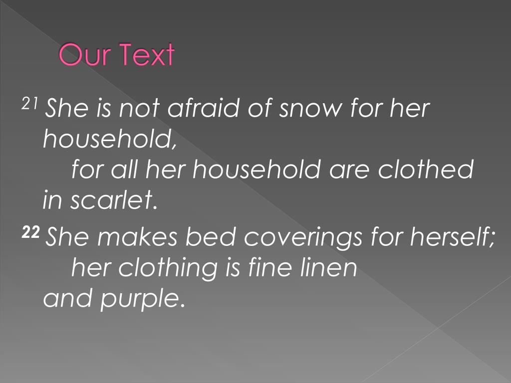 Our Text 21 She is not afraid of snow for her household, for all her household are clothed in scarlet. 22 She makes bed coverings for herself; her clothing is fine linen and purple.