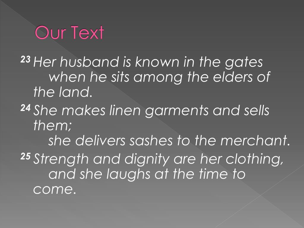Our Text 23Her husband is known in the gates when he sits among the elders of the land. 24She makes linen garments and sells them; she delivers sashes to the merchant. 25Strength and dignity are her clothing, and she laughs at the time to come.