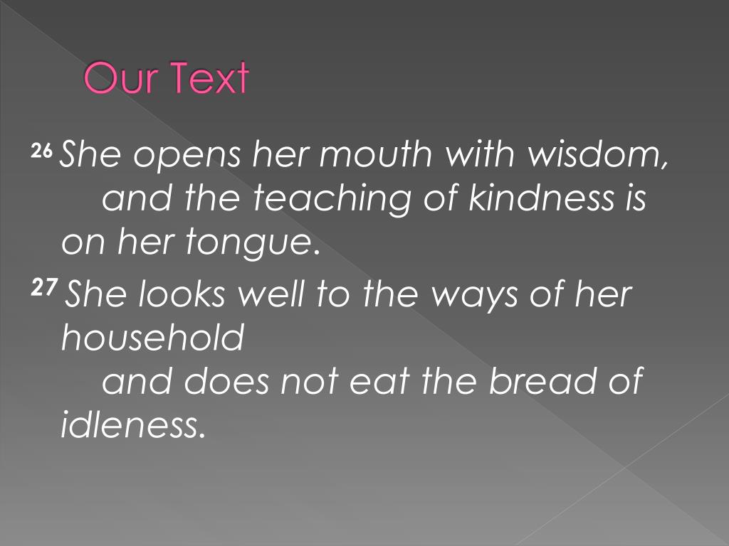Our Text 26 She opens her mouth with wisdom, and the teaching of kindness is on her tongue. 27 She looks well to the ways of her household and does not eat the bread of idleness.