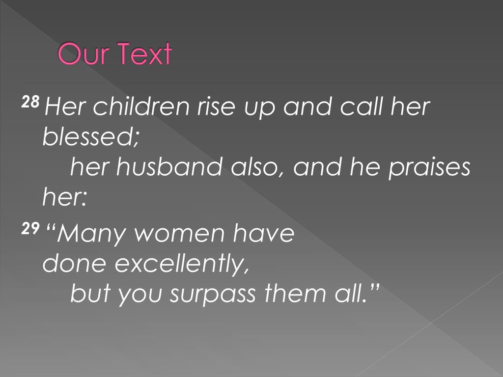 Our Text 28 Her children rise up and call her blessed; her husband also, and he praises her: 29 “Many women have done excellently, but you surpass them all.”