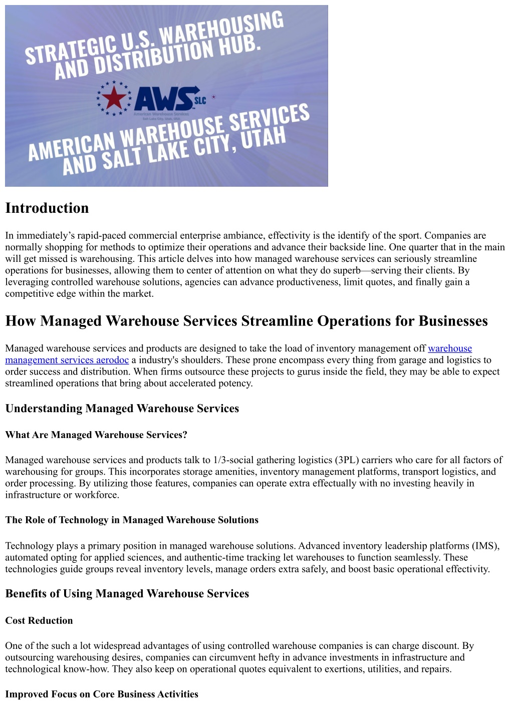 Introduction In immediately’s rapid-paced commercial enterprise ambiance, effectivity is the identify of the sport. Companies are normally shopping for methods to optimize their operations and advance their backside line. One quarter that in the main will get missed is warehousing. This article delves into how managed warehouse services can seriously streamline operations for businesses, allowing them to center of attention on what they do superb—serving their clients. By leveraging controlled warehouse solutions, agencies can advance productiveness, limit quotes, and finally gain a competitive edge within the market. How Managed Warehouse Services Streamline Operations for Businesses Managed warehouse services and products are designed to take the load of inventory management off warehouse management services aerodoc a industry's shoulders. These prone encompass every thing from garage and logistics to order success and distribution. When firms outsource these projects to gurus inside the field, they may be able to expect streamlined operations that bring about accelerated potency. Understanding Managed Warehouse Services What Are Managed Warehouse Services? Managed warehouse services and products talk to 1/3-social gathering logistics (3PL) carriers who care for all factors of warehousing for groups. This incorporates storage amenities, inventory management platforms, transport logistics, and order processing. By utilizing those features, companies can operate extra effectually with no investing heavily in infrastructure or workforce. The Role of Technology in Managed Warehouse Solutions Technology plays a primary position in managed warehouse solutions. Advanced inventory leadership platforms (IMS), automated opting for applied sciences, and authentic-time tracking let warehouses to function seamlessly. These technologies guide groups reveal inventory levels, manage orders extra safely, and boost basic operational effectivity. Benefits of Using Managed Warehouse Services Cost Reduction One of the such a lot widespread advantages of using controlled warehouse companies is can charge discount. By outsourcing warehousing desires, companies can circumvent hefty in advance investments in infrastructure and technological know-how. They also keep on operational quotes equivalent to exertions, utilities, and repairs. Improved Focus on Core Business Activities