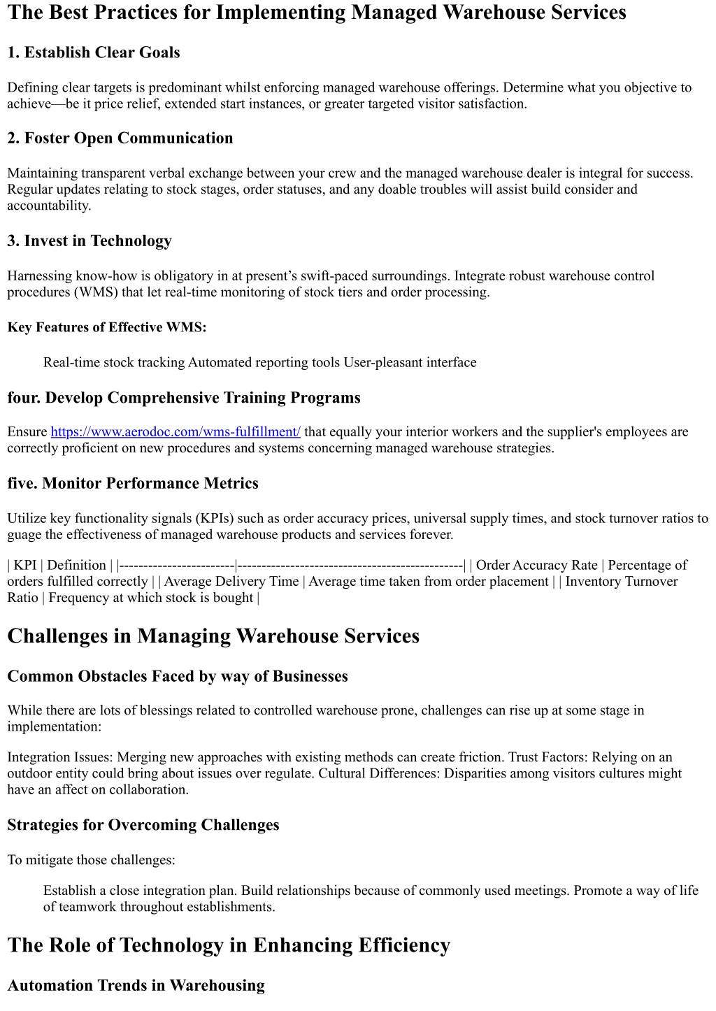 The Best Practices for Implementing Managed Warehouse Services 1. Establish Clear Goals Defining clear targets is predominant whilst enforcing managed warehouse offerings. Determine what you objective to achieve—be it price relief, extended start instances, or greater targeted visitor satisfaction. 2. Foster Open Communication Maintaining transparent verbal exchange between your crew and the managed warehouse dealer is integral for success. Regular updates relating to stock stages, order statuses, and any doable troubles will assist build consider and accountability. 3. Invest in Technology Harnessing know-how is obligatory in at present’s swift-paced surroundings. Integrate robust warehouse control procedures (WMS) that let real-time monitoring of stock tiers and order processing. Key Features of Effective WMS: Real-time stock tracking Automated reporting tools User-pleasant interface four. Develop Comprehensive Training Programs Ensure https://www.aerodoc.com/wms-fulfillment/ that equally your interior workers and the supplier's employees are correctly proficient on new procedures and systems concerning managed warehouse strategies. five. Monitor Performance Metrics Utilize key functionality signals (KPIs) such as order accuracy prices, universal supply times, and stock turnover ratios to guage the effectiveness of managed warehouse products and services forever. | KPI | Definition | |------------------------|-----------------------------------------------| | Order Accuracy Rate | Percentage of orders fulfilled correctly | | Average Delivery Time | Average time taken from order placement | | Inventory Turnover Ratio | Frequency at which stock is bought | Challenges in Managing Warehouse Services Common Obstacles Faced by way of Businesses While there are lots of blessings related to controlled warehouse prone, challenges can rise up at some stage in implementation: Integration Issues: Merging new approaches with existing methods can create friction. Trust Factors: Relying on an outdoor entity could bring about issues over regulate. Cultural Differences: Disparities among visitors cultures might have an affect on collaboration. Strategies for Overcoming Challenges To mitigate those challenges: Establish a close integration plan. Build relationships because of commonly used meetings. Promote a way of life of teamwork throughout establishments. The Role of Technology in Enhancing Efficiency Automation Trends in Warehousing