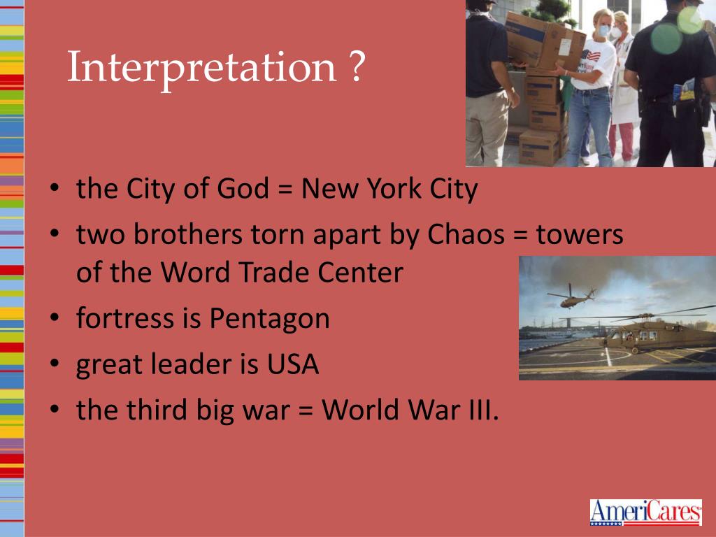 Interpretation ? • the City of God = New York City • two brothers torn apart by Chaos = towers of the Word Trade Center • fortress is Pentagon • great leader is USA • the third big war = World War III.