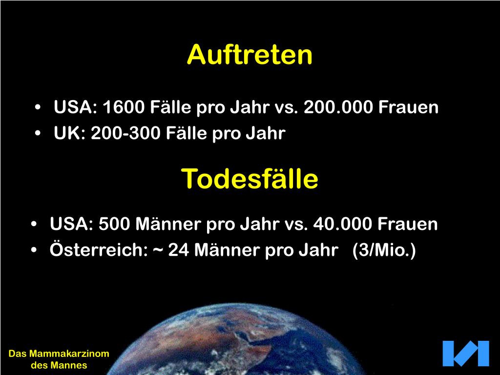 Auftreten • USA: 1600 Fälle pro Jahr vs. 200.000 Frauen • UK: 200-300 Fälle pro Jahr Todesfälle • USA: 500 Männer pro Jahr vs. 40.000 Frauen • Österreich: ~ 24 Männer pro Jahr (3/Mio.) Das Mammakarzinom des Mannes
