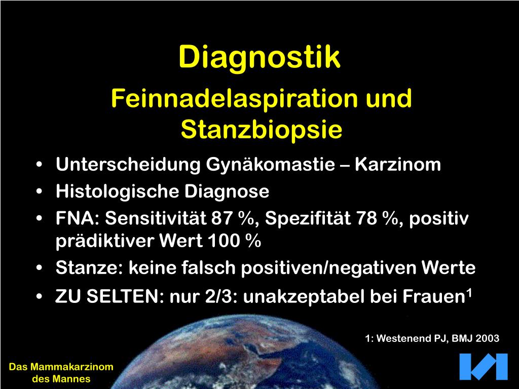 Diagnostik Mammografie • Kleine Brust: technisch schwierig • Große und dicke Brust: besser • Gynäkomastie: Drüsenanteil identifizierbar • Mikroverkalkungen: gleiche Bedeutungwie weibliche Brust Das Mammakarzinom des Mannes
