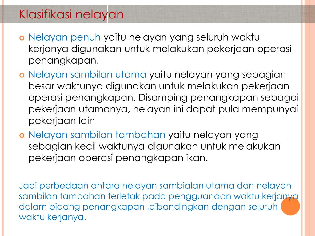 Klasifikasinelayan • Nelayanpenuhyaitunelayan yang seluruhwaktukerjanyadigunakanuntukmelakukanpekerjaanoperasipenangkapan. • Nelayansambilanutamayaitunelayan yang sebagianbesarwaktunyadigunakanuntukmelakukanpekerjaanoperasipenangkapan. Disampingpenangkapansebagaipekerjaanutamanya, nelayaninidapat pula mempunyaipekerjaan lain • Nelayansambilantambahanyaitunelayan yang sebagiankecilwaktunyadigunakanuntukmelakukanpekerjaanoperasipenangkapanikan. Jadiperbedaanantaranelayansambialanutamadannelayansambilantambahanterletakpadapengguanaanwaktukerjanyadalambidangpenangkapan ,dibandingkandenganseluruhwaktukerjanya.
