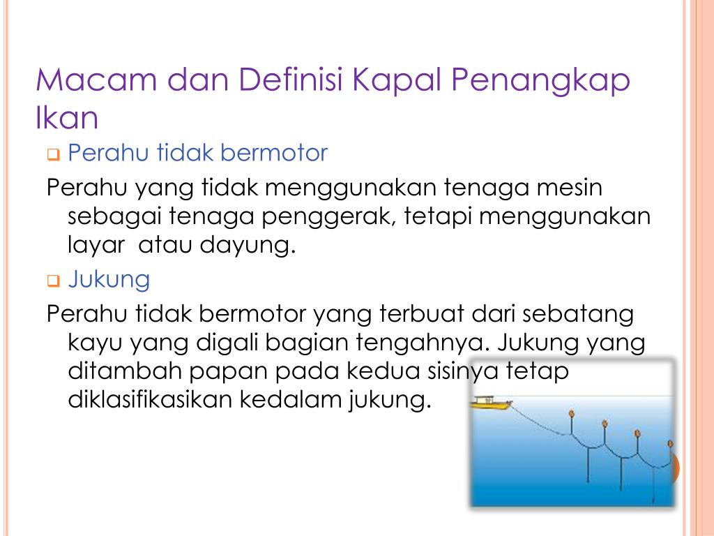 Macam dan Definisi Kapal Penangkap Ikan • Perahu tidak bermotor Perahu yang tidak menggunakan tenaga mesin sebagai tenaga penggerak, tetapi menggunakan layar atau dayung. • Jukung Perahu tidak bermotor yang terbuat dari sebatang kayu yang digali bagian tengahnya. Jukung yang ditambah papan pada kedua sisinya tetap diklasifikasikan kedalam jukung.