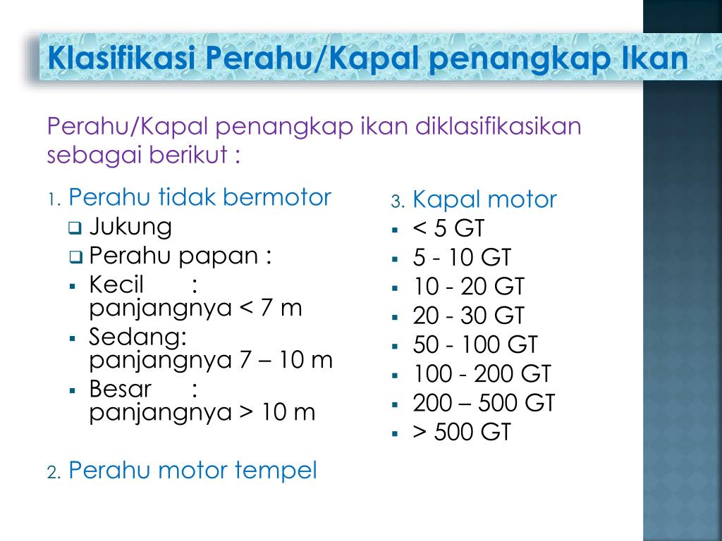 KlasifikasiPerahu/KapalpenangkapIkan Perahu/Kapal penangkap ikan diklasifikasikan sebagai berikut : • Perahutidakbermotor • Jukung • Perahupapan : • Kecil : panjangnya < 7 m • Sedang: panjangnya 7 – 10 m • Besar : panjangnya > 10 m • Perahu motor tempel • Kapal motor • < 5 GT • 5 - 10 GT • 10 - 20 GT • 20 - 30 GT • 50 - 100 GT • 100 - 200 GT • 200 – 500 GT • > 500 GT