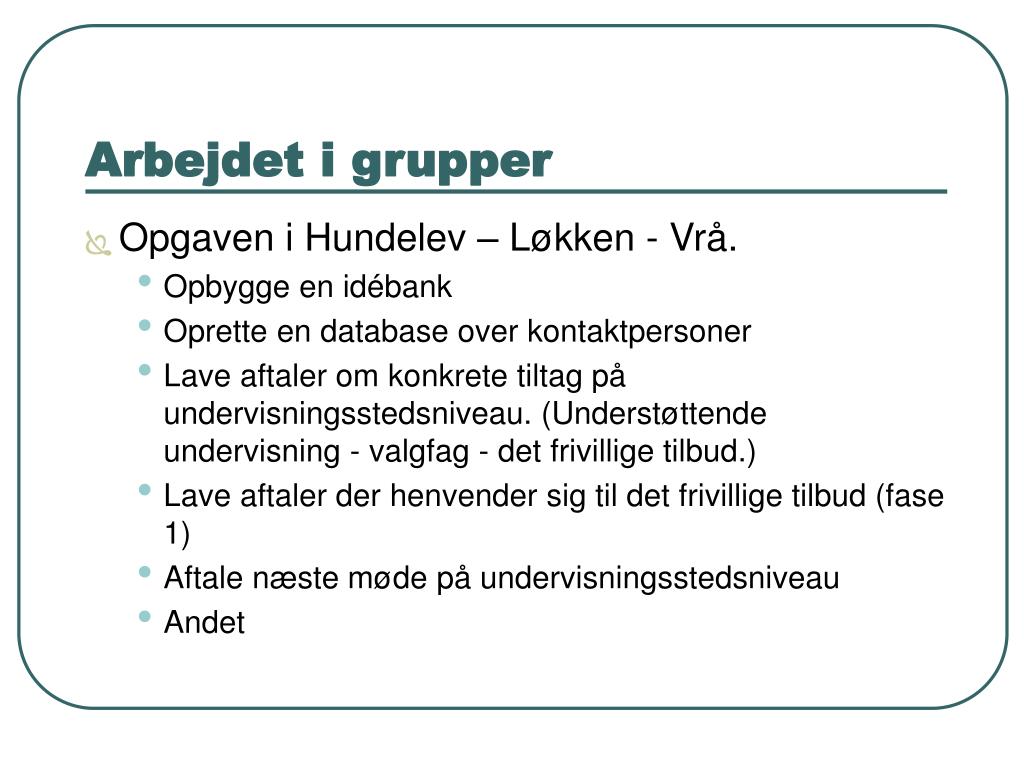 Arbejdet i grupper • Opgaven i Hundelev – Løkken - Vrå. • Opbygge en idébank • Oprette en database over kontaktpersoner • Lave aftaler om konkrete tiltag på undervisningsstedsniveau. (Understøttende undervisning - valgfag - det frivillige tilbud.) • Lave aftaler der henvender sig til det frivillige tilbud (fase 1) • Aftale næste møde på undervisningsstedsniveau • Andet