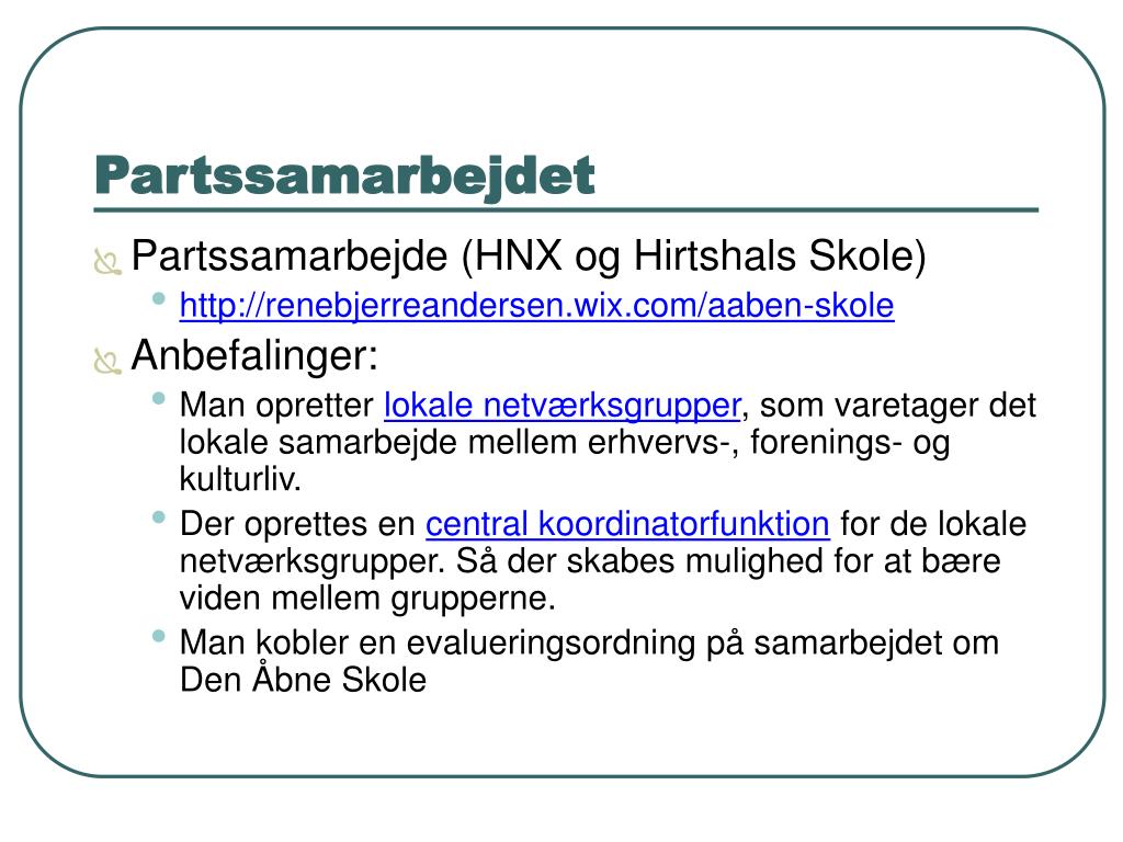 Partssamarbejdet • Partssamarbejde (HNX og Hirtshals Skole) • http://renebjerreandersen.wix.com/aaben-skole • Anbefalinger: • Man opretter lokale netværksgrupper, som varetager det lokale samarbejde mellem erhvervs-, forenings- og kulturliv. • Der oprettes en central koordinatorfunktion for de lokale netværksgrupper. Så der skabes mulighed for at bære viden mellem grupperne. • Man kobler en evalueringsordning på samarbejdet om Den Åbne Skole
