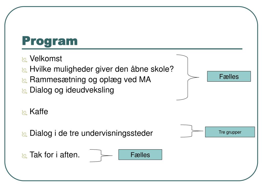 Program Fælles Fælles Tre grupper • Velkomst • Hvilke muligheder giver den åbne skole? • Rammesætning og oplæg ved MA • Dialog og ideudveksling • Kaffe • Dialog i de tre undervisningssteder • Tak for i aften.