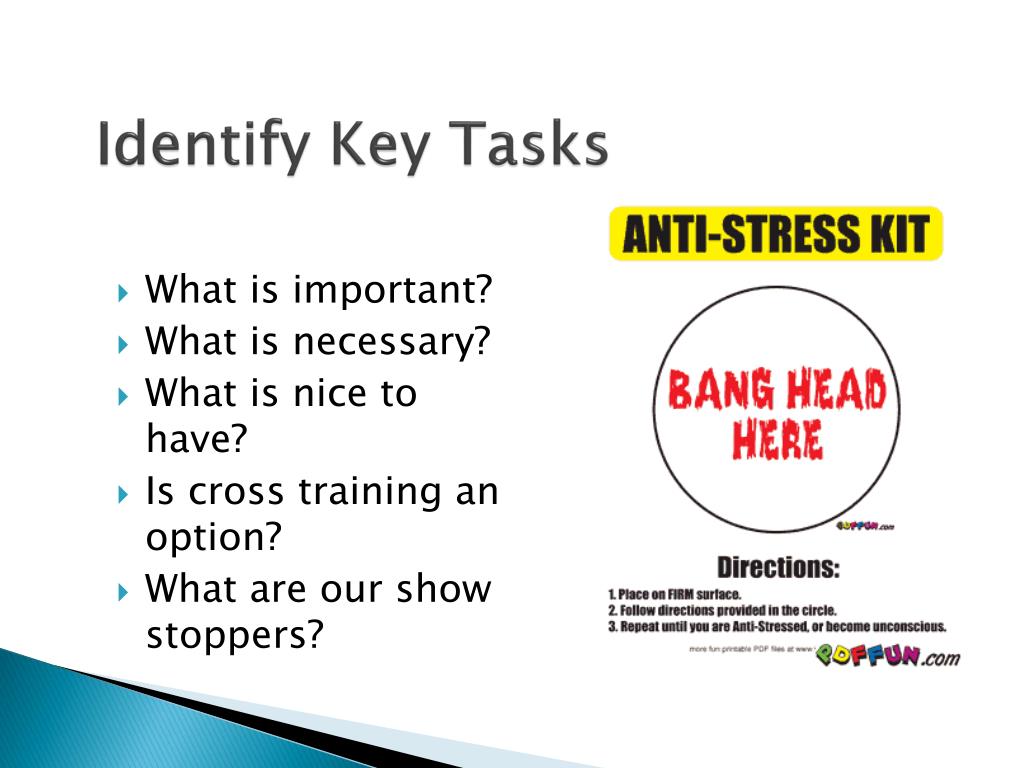 Identify Key Tasks • What is important? • What is necessary? • What is nice to have? • Is cross training an option? • What are our show stoppers?