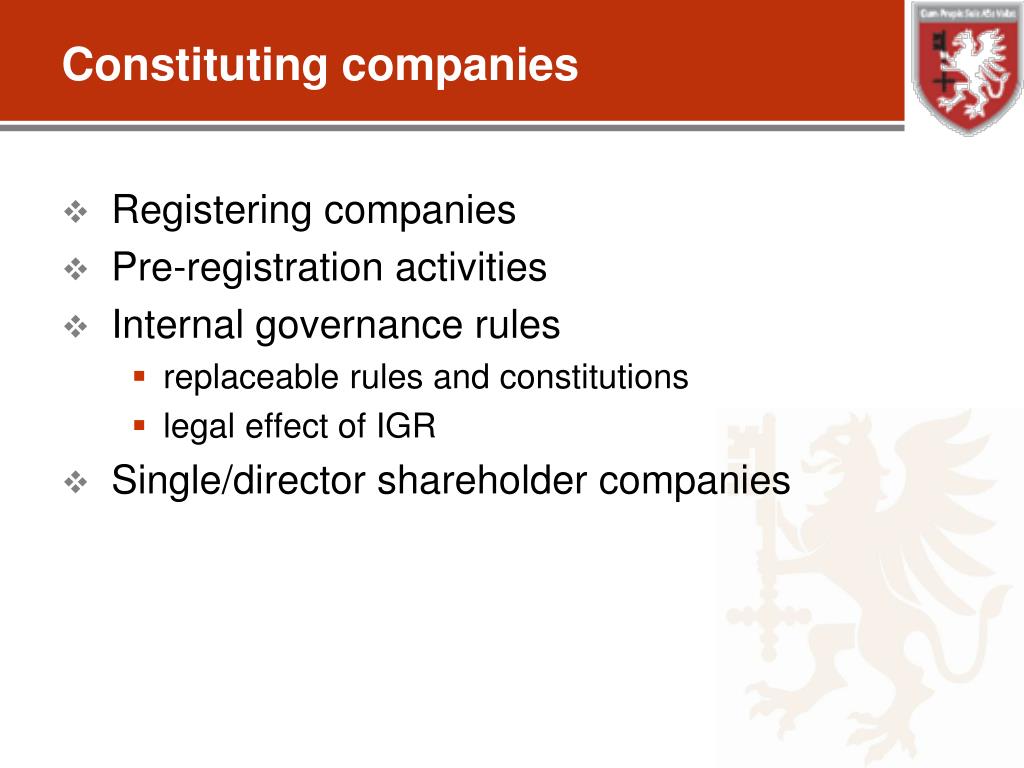 Constituting companies • Registering companies • Pre-registration activities • Internal governance rules • replaceable rules and constitutions • legal effect of IGR • Single/director shareholder companies