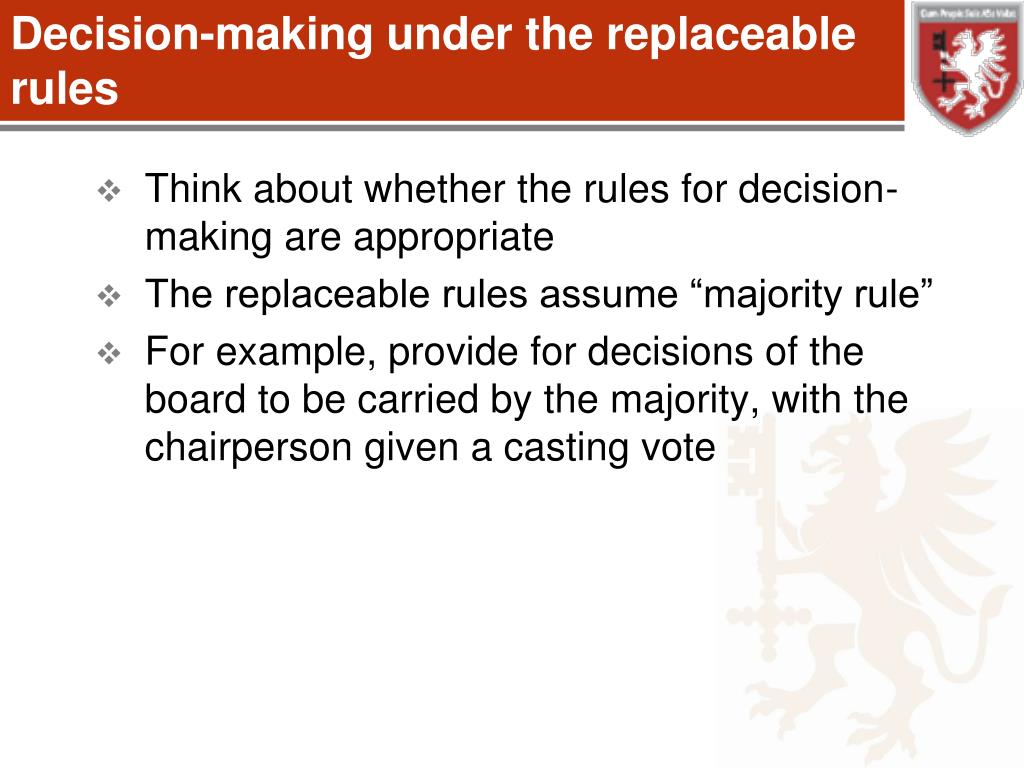 Decision-making under the replaceable rules • Think about whether the rules for decision-making are appropriate • The replaceable rules assume “majority rule” • For example, provide for decisions of the board to be carried by the majority, with the chairperson given a casting vote