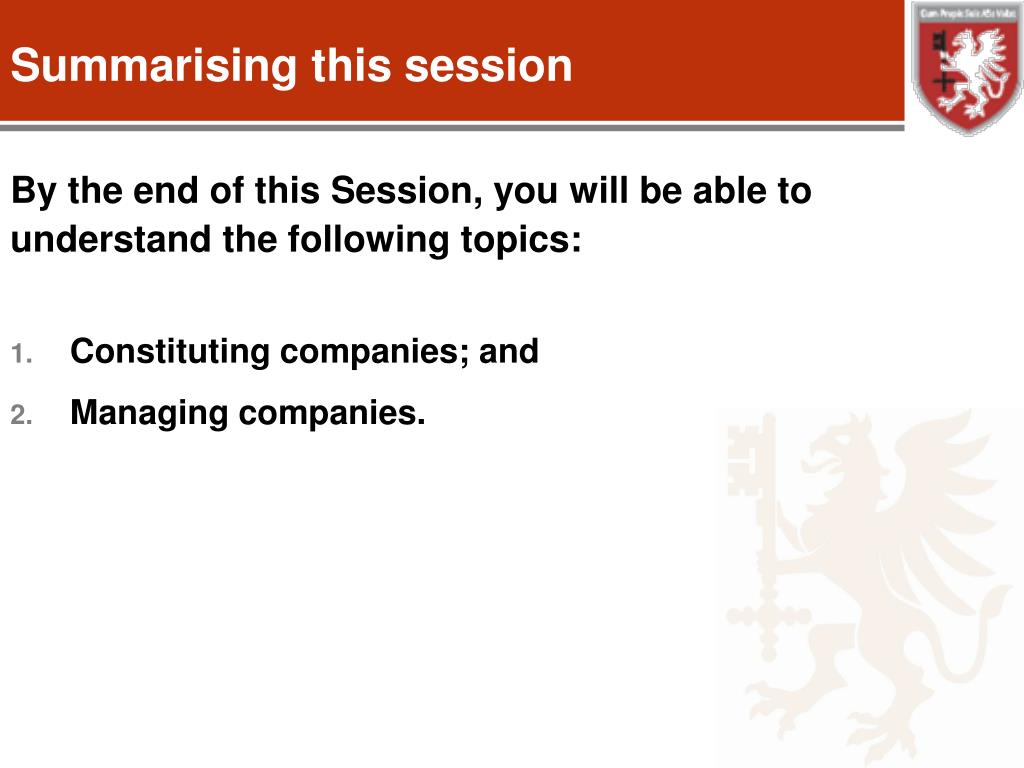 Summarising this session By the end of this Session, you will be able to understand the following topics: Constituting companies; and Managing companies.