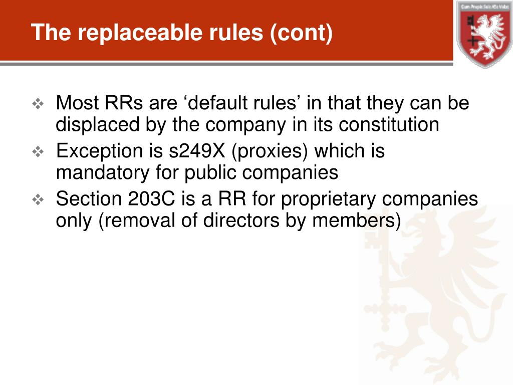 The replaceable rules (cont) • Most RRs are ‘default rules’ in that they can be displaced by the company in its constitution • Exception is s249X (proxies) which is mandatory for public companies • Section 203C is a RR for proprietary companies only (removal of directors by members)