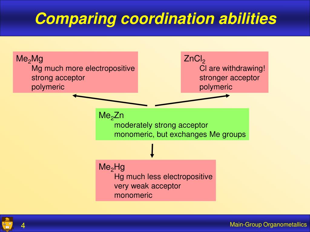 Comparing coordination abilities • Me2Mg • Mg much more electropositivestrong acceptorpolymeric • ZnCl2 • Cl are withdrawing!stronger acceptorpolymeric • Me2Zn • moderately strong acceptormonomeric, but exchanges Me groups • Me2Hg • Hg much less electropositive • very weak acceptormonomeric Main-Group Organometallics