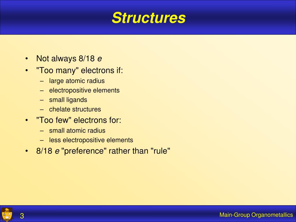 Structures • Not always 8/18 e • "Too many" electrons if: • large atomic radius • electropositive elements • small ligands • chelate structures • "Too few" electrons for: • small atomic radius • less electropositive elements • 8/18 e "preference" rather than "rule" Main-Group Organometallics