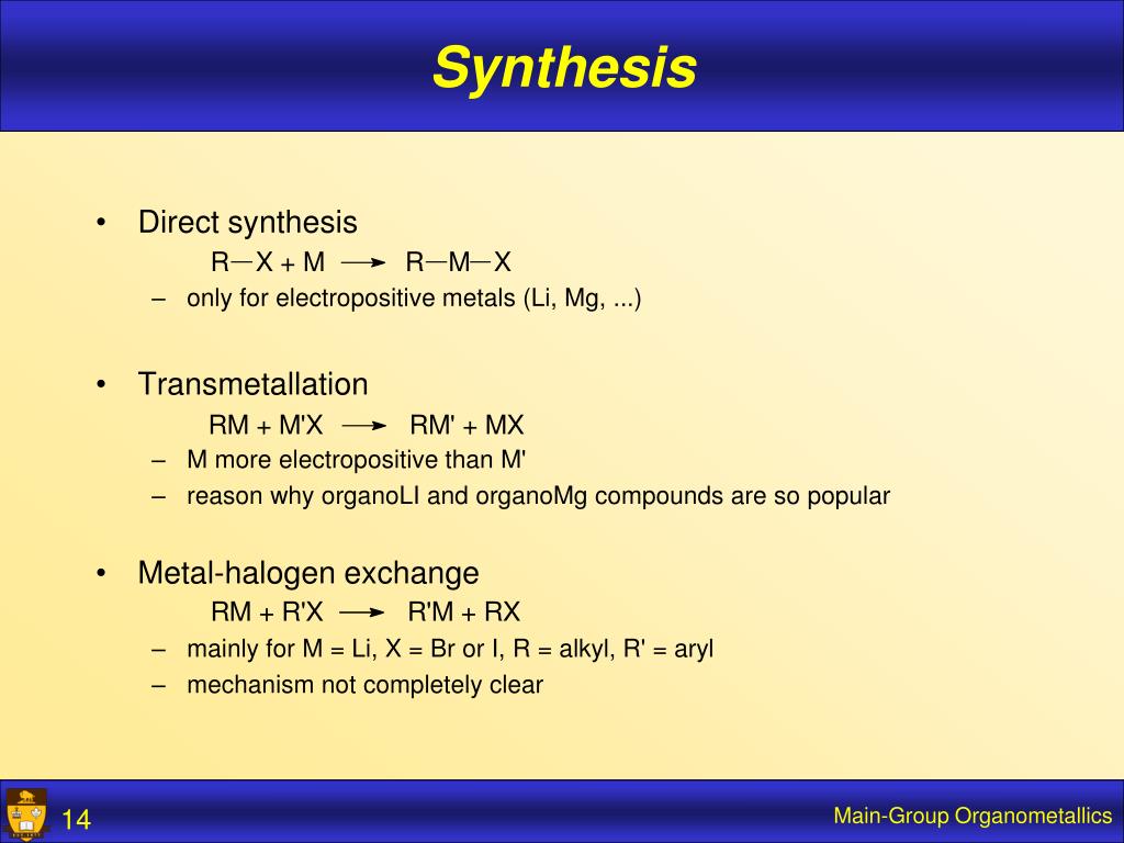 Synthesis • Direct synthesis • only for electropositive metals (Li, Mg, ...) • Transmetallation • M more electropositive than M' • reason why organoLI and organoMg compounds are so popular • Metal-halogen exchange • mainly for M = Li, X = Br or I, R = alkyl, R' = aryl • mechanism not completely clear Main-Group Organometallics