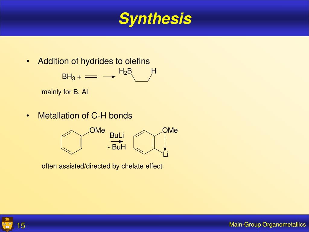 Synthesis • Addition of hydrides to olefins mainly for B, Al • Metallation of C-H bonds often assisted/directed by chelate effect Main-Group Organometallics