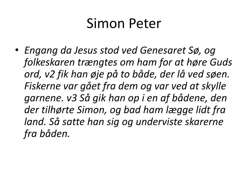 Simon Peter • Engang da Jesus stod ved Genesaret Sø, og folkeskaren trængtes om ham for at høre Guds ord, v2 fik han øje på to både, der lå ved søen. Fiskerne var gået fra dem og var ved at skylle garnene. v3 Så gik han op i en af bådene, den der tilhørte Simon, og bad ham lægge lidt fra land. Så satte han sig og underviste skarerne fra båden.