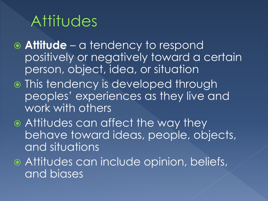 Attitudes • Attitude – a tendency to respond positively or negatively toward a certain person, object, idea, or situation • This tendency is developed through peoples’ experiences as they live and work with others • Attitudes can affect the way they behave toward ideas, people, objects, and situations • Attitudes can include opinion, beliefs, and biases