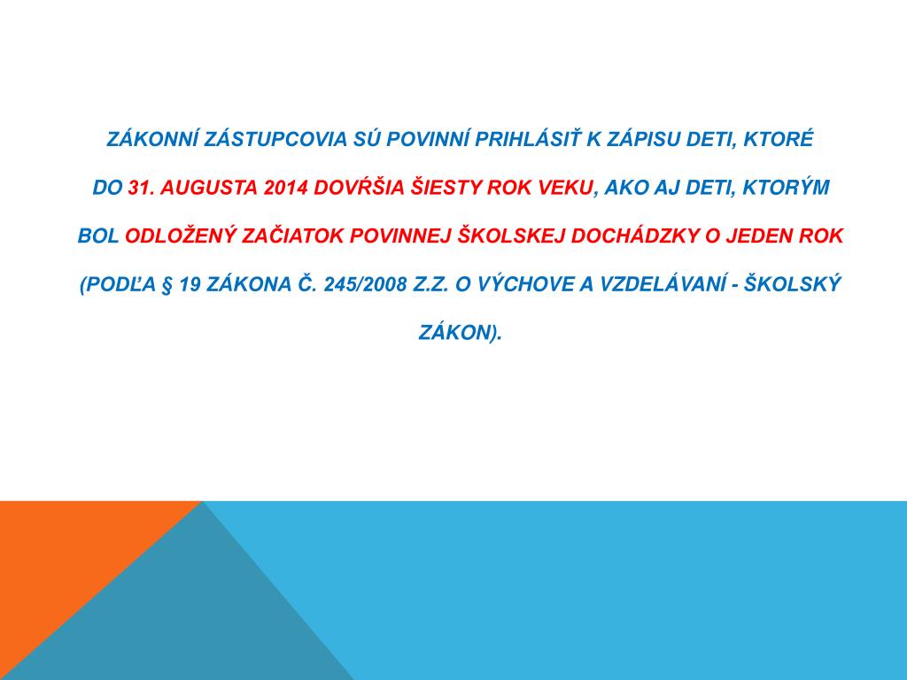 Zákonní zástupcovia sú povinní prihlásiť k zápisu deti, ktoré do 31. augusta 2014 dovŕšia šiesty rok veku, ako aj deti, ktorým bol odložený začiatok povinnej školskej dochádzky o jeden rok (podľa § 19 zákona č. 245/2008 Z.z. o výchove a vzdelávaní -školský zákon).