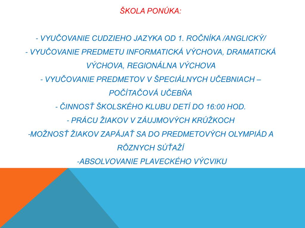 ŠKOLA PONÚKA: - Vyučovanie cudzieho jazyka od 1. ročníka /anglický/- Vyučovanie predmetu informatická výchova, dramatická výchova, regionálna výchova- Vyučovanie predmetov v špeciálnych učebniach – počítačová učebňa- Činnosť školského klubu detí do 16:00 hod.- Prácu žiakov v záujmových krúžkoch-Možnosť žiakov zapájať sa do predmetových olympiád a rôznych súťaží -Absolvovanie plaveckého výcviku