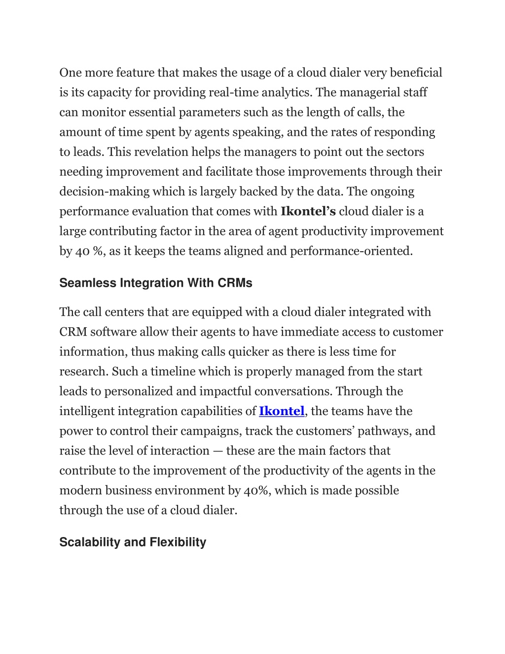 One more feature that makes the usage of a cloud dialer very beneficial is its capacity for providing real-time analytics. The managerial staff can monitor essential parameters such as the length of calls, the amount of time spent by agents speaking, and the rates of responding to leads. This revelation helps the managers to point out the sectors needing improvement and facilitate those improvements through their decision-making which is largely backed by the data. The ongoing performance evaluation that comes with Ikontel’scloud dialer is a large contributing factor in the area of agent productivity improvement by 40 %, as it keeps the teams aligned and performance-oriented. Seamless Integration With CRMs The call centers that are equipped with a cloud dialer integrated with CRM software allow their agents to have immediate access to customer information, thus making calls quicker as there is less time for research. Such a timeline which is properly managed from the start leads to personalized and impactful conversations. Through the intelligent integration capabilities of Ikontel, the teams have the power to control their campaigns, track the customers’ pathways, and raise the level of interaction — these are the main factors that contribute to the improvement of the productivity of the agents in the modern business environment by 40%, which is made possible through the use of a cloud dialer. Scalability and Flexibility