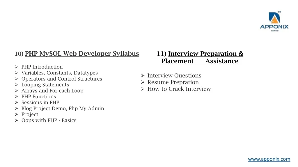 10) PHP MySQL Web Developer Syllabus • PHP Introduction • Variables, Constants, Datatypes • Operators and Control Structures • Looping Statements • Arrays and For each Loop • PHP Functions • Sessions in PHP • Blog Project Demo, Php My Admin • Project • Oops with PHP - Basics • 11) Interview Preparation & Placement Assistance • Interview Questions • Resume Prepration • How to Crack Interview www.apponix.com