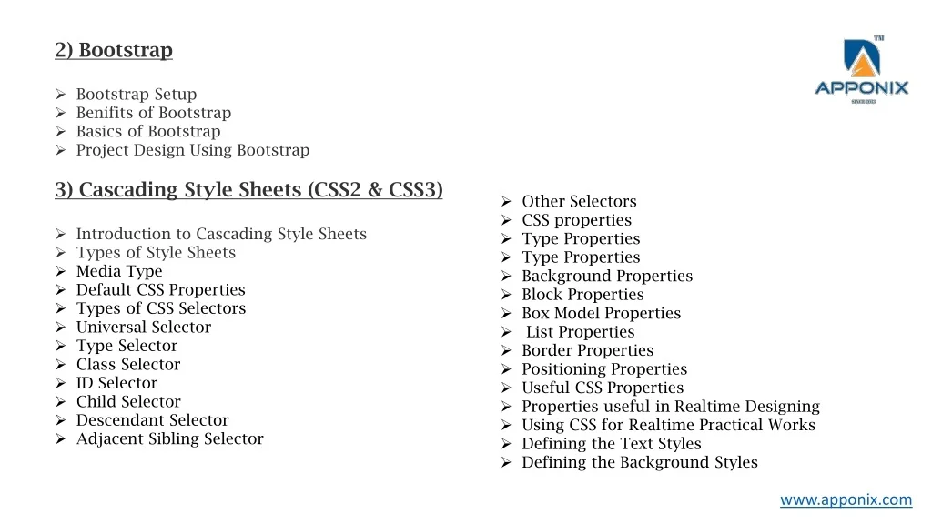 2) Bootstrap • Bootstrap Setup • Benifits of Bootstrap • Basics of Bootstrap • Project Design Using Bootstrap • 3) Cascading Style Sheets (CSS2 & CSS3) • Introduction to Cascading Style Sheets • Types of Style Sheets • Media Type • Default CSS Properties • Types of CSS Selectors • Universal Selector • Type Selector • Class Selector • ID Selector • Child Selector • Descendant Selector • Adjacent Sibling Selector • Other Selectors • CSS properties • Type Properties • Type Properties • Background Properties • Block Properties • Box Model Properties • List Properties • Border Properties • Positioning Properties • Useful CSS Properties • Properties useful in Realtime Designing • Using CSS for Realtime Practical Works • Defining the Text Styles • Defining the Background Styles www.apponix.com