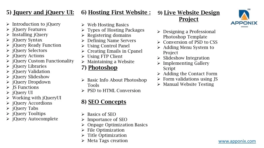 5) Jquery and jQuery UI: • Introduction to jQuery • jQuery Features • Installing jQuery • jQuery Syntax • jQuery Ready Function • jQuery Selectors • jQuery Actions • jQuery Custom Functionality • jQuery Libraries • jQuery Validation • jQuery Slideshow • jQuery Dropdown • JS Functions • jQuery UI • Working with jQueryUI • jQuery Accordions • jQuery Tabs • jQuery Tooltips • jQuery Autocomplete • 6)Hosting First Website : • Web Hosting Basics • Types of Hosting Packages • Registering domains • Defining Name Servers • Using Control Panel • Creating Emails in Cpanel • Using FTP Client • Maintaining a Website • 7) Photoshop • Basic Info About Photoshop Tools • PSD to HTML Conversion • 8) SEO Concepts • Basics of SEO • Importance of SEO • Onpage Optimization Basics • File Optimization • Title Optimization • Meta Tags creation • 9) Live Website Design Project • Designing a Professional Photoshop Template • Conversion of PSD to CSS • Adding Menu System to Project • Slideshow Integration • Implementing Gallery Script • Adding the Contact Form • Form validations using JS • Manual Website Testing www.apponix.com