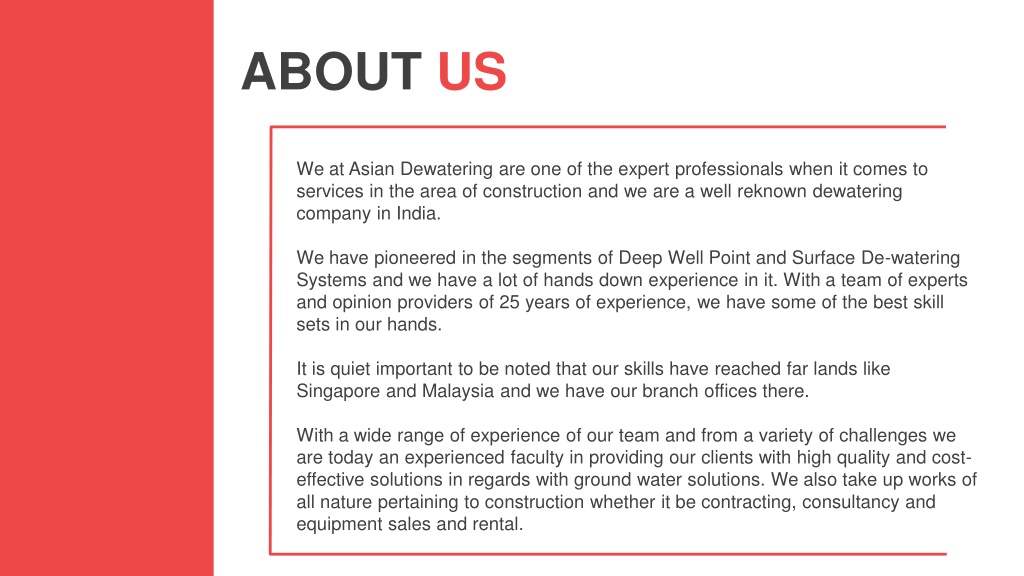 ABOUT US We at Asian Dewatering are one of the expert professionals when it comes to services in the area of construction and we are a well reknown dewatering company in India. We have pioneered in the segments of Deep Well Point and Surface De-watering Systems and we have a lot of hands down experience in it. With a team of experts and opinion providers of 25 years of experience, we have some of the best skill sets in our hands. It is quiet important to be noted that our skills have reached far lands like Singapore and Malaysia and we have our branch offices there. With a wide range of experience of our team and from a variety of challenges we are today an experienced faculty in providing our clients with high quality and cost- effective solutions in regards with ground water solutions. We also take up works of all nature pertaining to construction whether it be contracting, consultancy and equipment sales and rental.