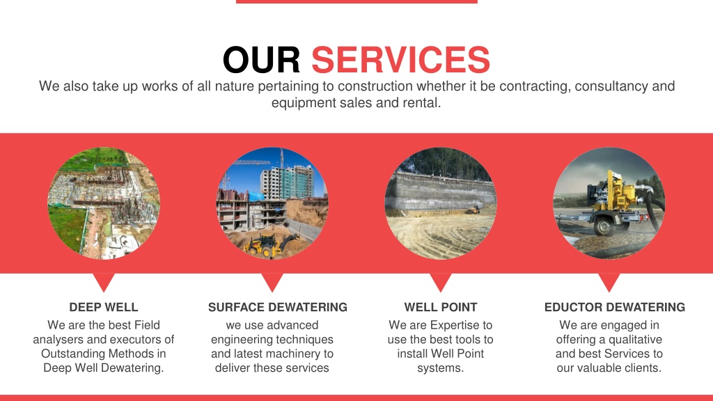 OUR SERVICES We also take up works of all nature pertaining to construction whether it be contracting, consultancy and equipment sales and rental. DEEP WELL We are the best Field analysers and executors of Outstanding Methods in Deep Well Dewatering. SURFACE DEWATERING we use advanced engineering techniques and latest machinery to deliver these services WELL POINT We are Expertise to use the best tools to install Well Point systems. EDUCTOR DEWATERING We are engaged in offering a qualitative and best Services to our valuable clients.