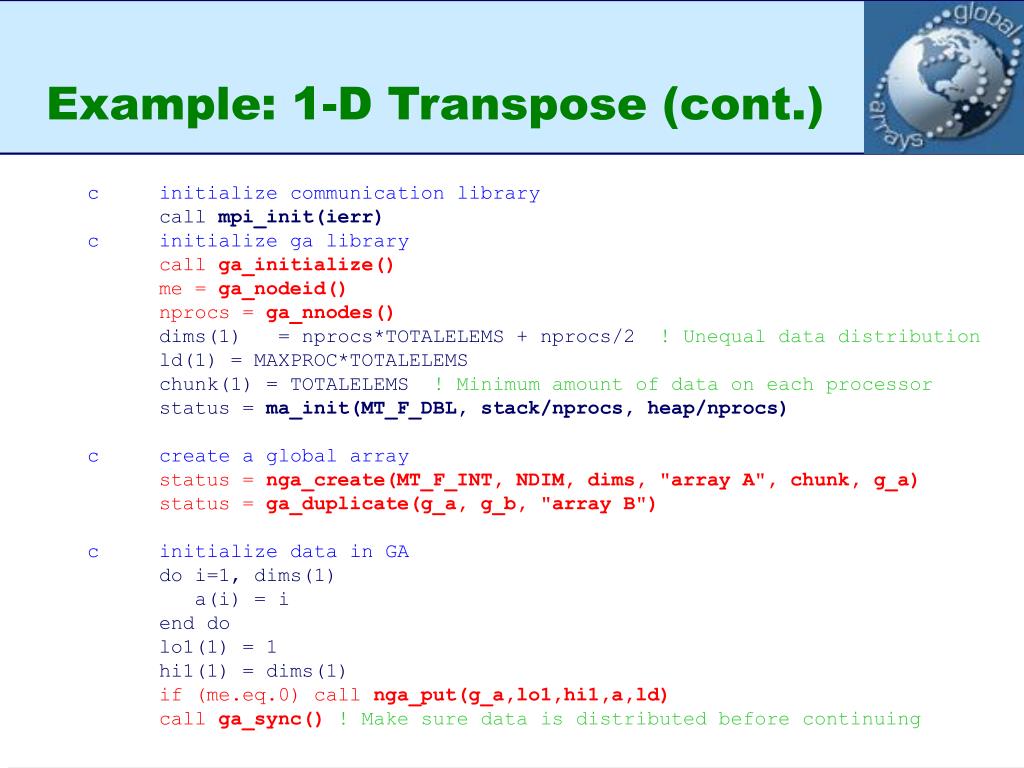 Example: 1-D Transpose (cont.) #define NDIM 1 #define TOTALELEMS 197 #define MAXPROC 128 program main implicit none #include "mafdecls.fh" #include "global.fh" integer dims(3), chunk(3), nprocs, me, i, lo(3), hi(3), lo1(3) integer hi1(3), lo2(3), hi2(3), ld(3), nelem integer g_a, g_b, a(MAXPROC*TOTALELEMS), b(MAXPROC*TOTALELEMS) integer heap, stack, ichk, ierr logical status heap = 300000 stack = 300000