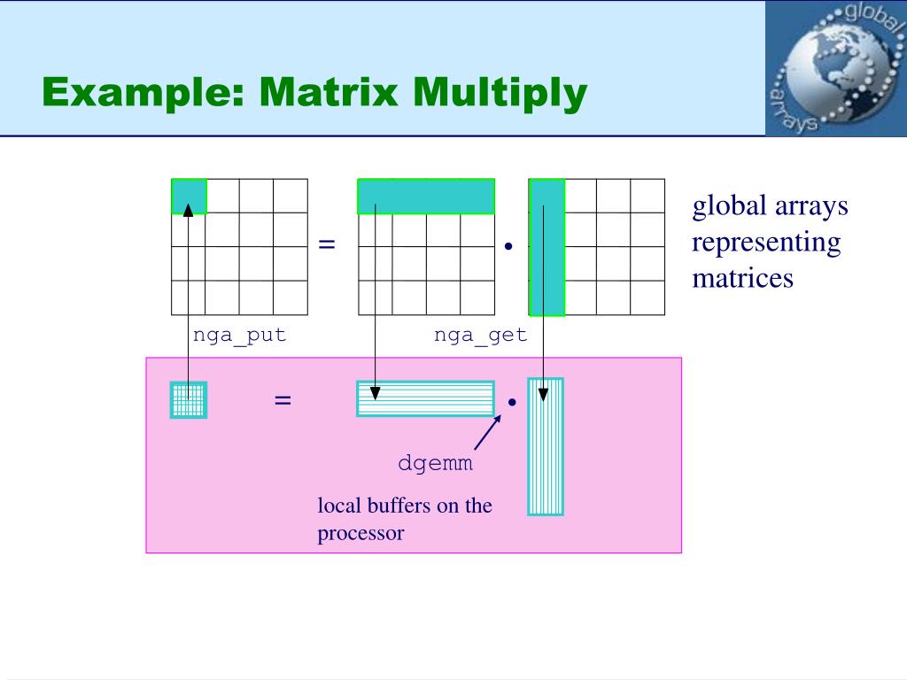 Example: Matrix Multiply global arrays representing matrices = • nga_put nga_get = • dgemm local buffers on the processor