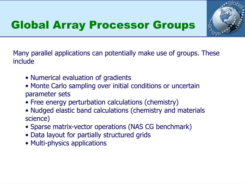 Global Array Processor Groups • Many parallel applications can potentially make use of groups. These include • Numerical evaluation of gradients • Monte Carlo sampling over initial conditions or uncertain parameter sets • Free energy perturbation calculations (chemistry) • Nudged elastic band calculations (chemistry and materials science) • Sparse matrix-vector operations (NAS CG benchmark) • Data layout for partially structured grids • Multi-physics applications