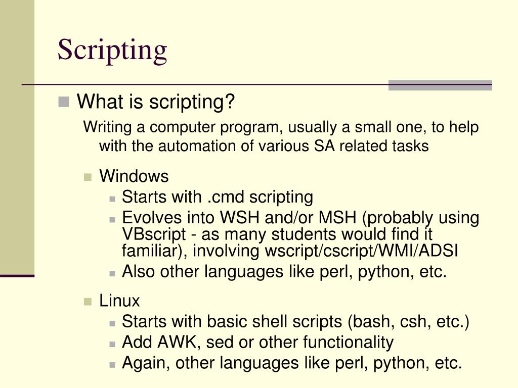 Scripting • What is scripting? Writing a computer program, usually a small one, to help with the automation of various SA related tasks • Windows • Starts with .cmd scripting • Evolves into WSH and/or MSH (probably using VBscript - as many students would find it familiar), involving wscript/cscript/WMI/ADSI • Also other languages like perl, python, etc. • Linux • Starts with basic shell scripts (bash, csh, etc.) • Add AWK, sed or other functionality • Again, other languages like perl, python, etc.