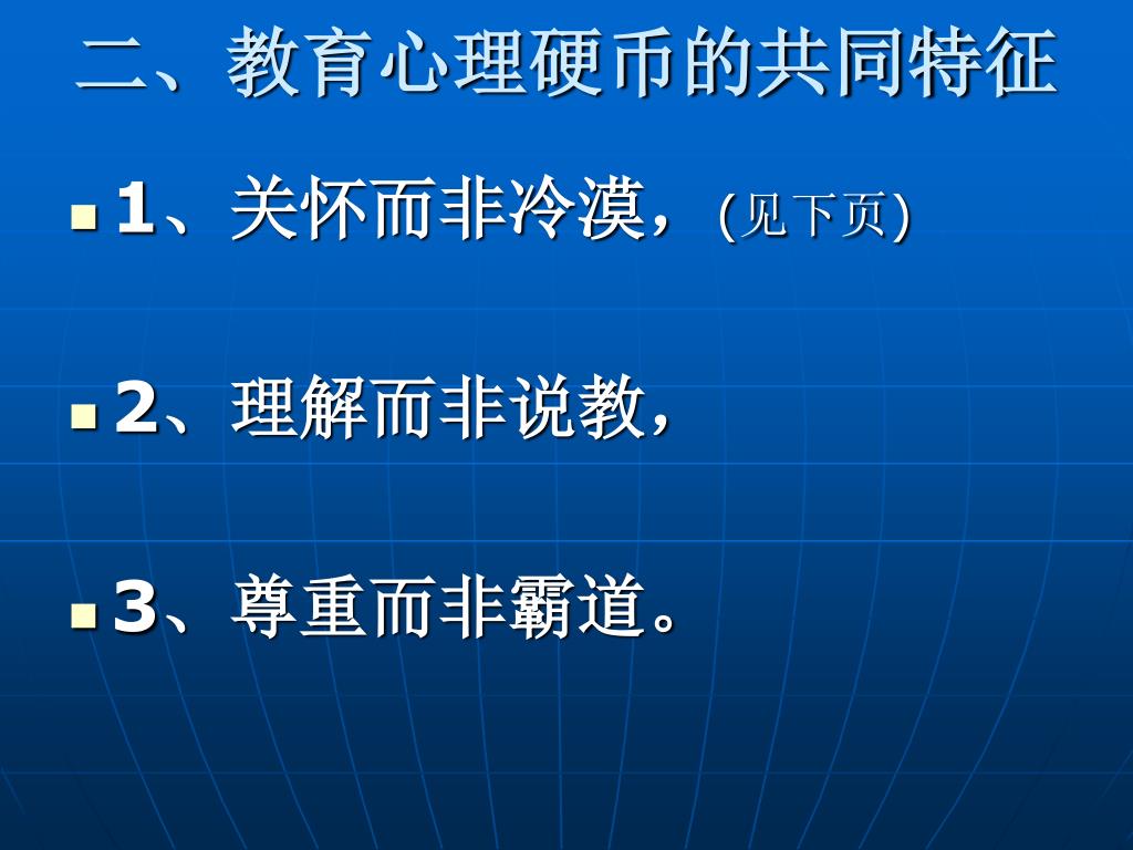 二、教育心理硬币的共同特征 • 1、关怀而非冷漠,(见下页) • 2、理解而非说教, • 3、尊重而非霸道。