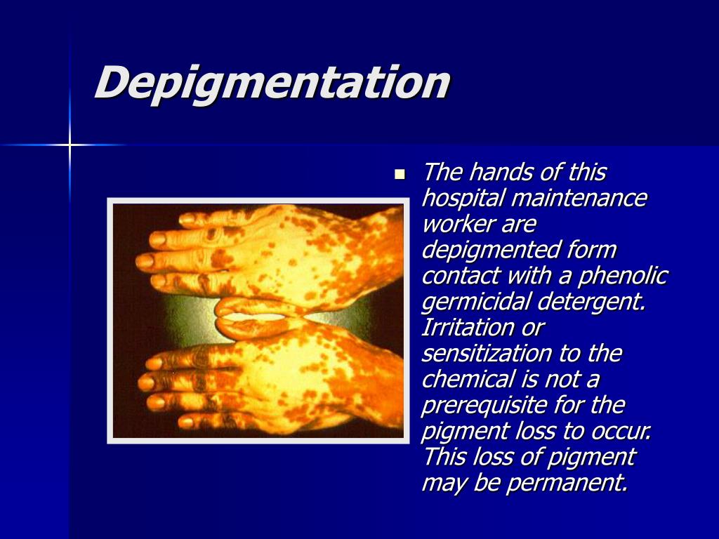 Depigmentation • The hands of this hospital maintenance worker are depigmented form contact with a phenolic germicidal detergent. Irritation or sensitization to the chemical is not a prerequisite for the pigment loss to occur. This loss of pigment may be permanent.